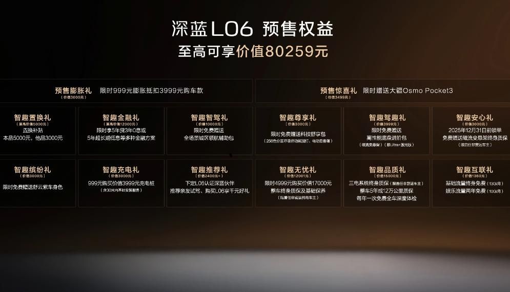 为回馈首批用户,深蓝L06推出了丰厚的预售权益。即日起至上市前,用户通过官方App/小程序支付999元订金,即可锁定首任车主终身整车质保+三电质保、3年免费公共充电(3000度/年)、终身免费OTA与流量、优先交付及专属客服通道等权益。此外,999元还可抵扣3999元购车款,限时赠送价值1万元的全场景城区领航辅助包、3000元科技舒享包,以及价值3499元的大疆Pocket3,置换补贴最高5000元,支持3年0息金融方案。