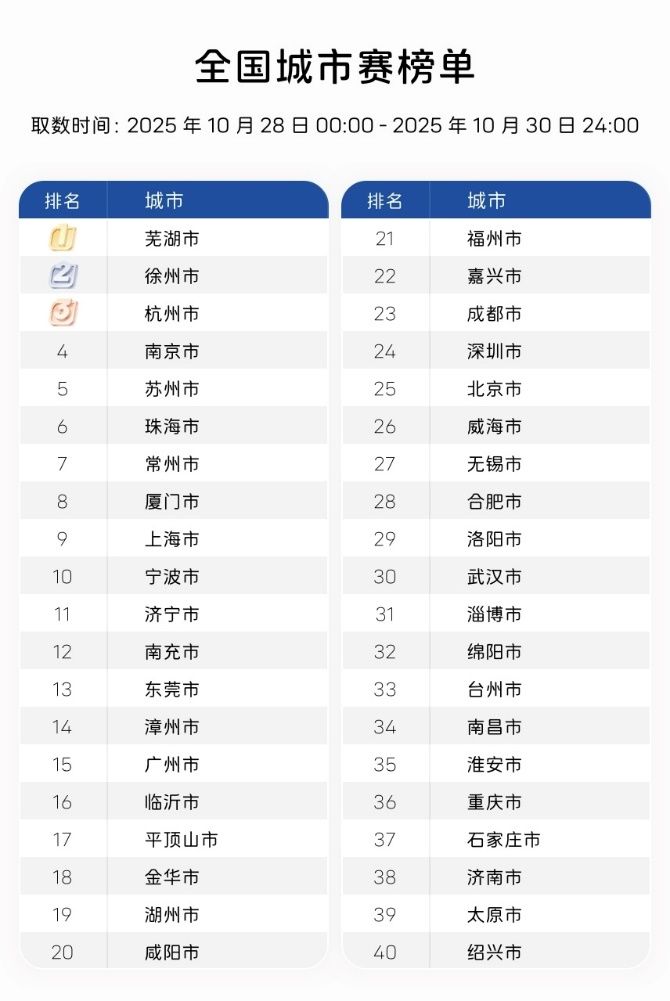 ADS全城一心奖根据各城市报名活动车主,城市辅助驾驶里程占比进行排名,所有报名车主均有机会瓜分百万E值。截至10月30日24时,芜湖、徐州、杭州、南京等城市表现优异,位居榜单前列,展现出全国各地阿维塔车主对华为乾崑ADS 4的信任与高度认可。
