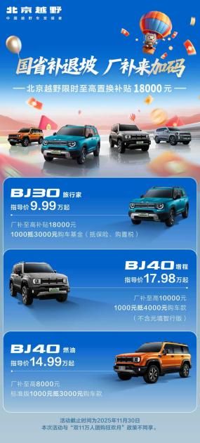 其中,BJ30旅行家指导价9.99万元起,厂补至高补贴18000元,还享1000可抵3000元购车基金优惠(抵保险、购置税);BJ40增程指导价17.98万元起,厂补至高10000元,还享1000元抵4000元购车款优惠(不含元境智行版);BJ40燃油指导价14.99万元起,厂补至高8000元,还享标准版1000元可抵3000元购车款优惠。此次厂补优惠截止时间为2025年11月30日,与“双11万人团购狂欢月”政策不同享。