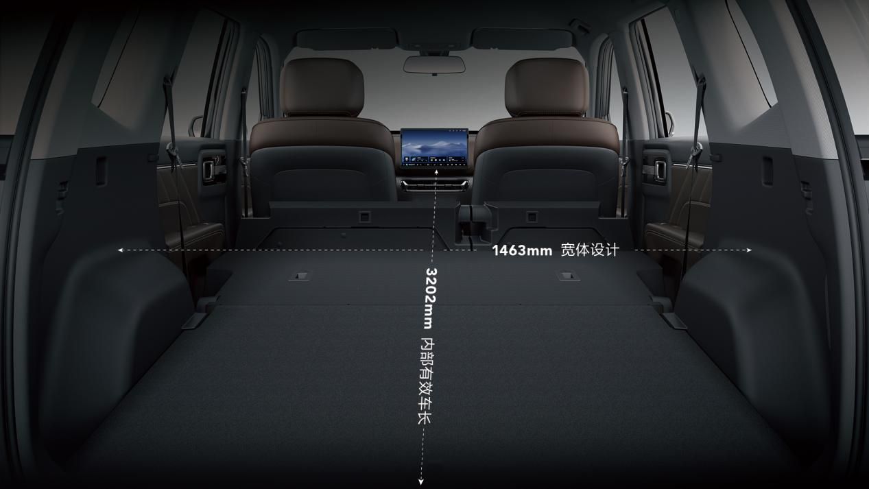 车内空间布局尤为考究:内部有效车长达3202mm,后排1463mm超宽体设计,确保三人同坐依然舒展;前后排座间距达990mm,身高1米8的乘