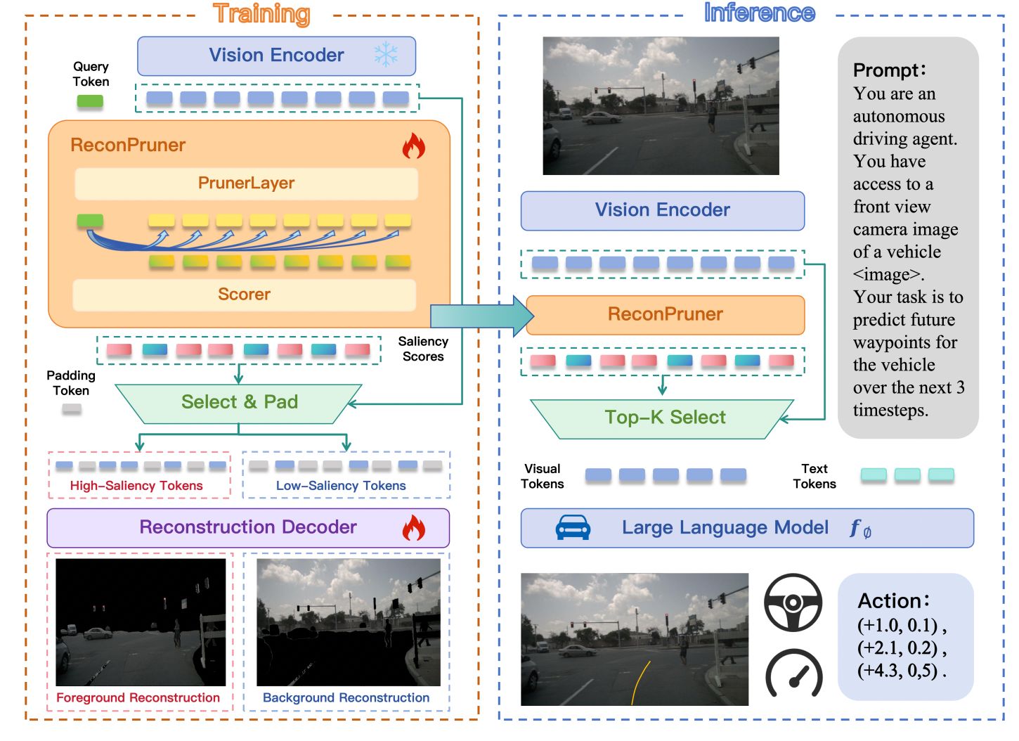 在训练阶段,论文中提出了一种新颖的“前景-背景对抗重建”策略,以增强 ReconPruner 对前景视觉 Token 的感知能力;在推理阶段,ReconPruner可直接嵌入自动驾驶VLA模型,用于 Token 剪枝。