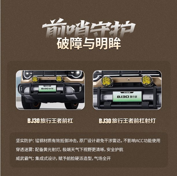 BJ30旅行王者前杠,具备有效防护性能,采用锰钢材质打造,可有效抵御行驶过程中的各类冲击;其原厂适配设计可避免与雷达系统发生干涉,确保ACC自适应巡航功能正常运行。同时,套件配备的黄光射灯具备强穿透性,即便在迷雾等极端天气条件下,也能显著提升视野清晰度,为出行安全保驾护航。前杠与射灯的集成式设计,赋予车辆前脸硬朗大气的硬派造型,尽显气场十足。