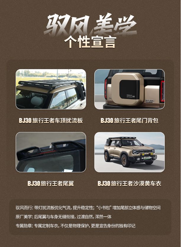 BJ30旅行王者车顶扰流板可优化车身周围气流分布,进一步提升行驶稳定性;尾门背包不仅增强了车辆尾部的立体视觉效果,更拓展了额外储物空间;尾翼与车身无缝衔接,过渡自然、浑然一体,尽显设计质感;专属定制大漠金车衣,既为车身提供物理防护,更为车辆彰显独特身份。