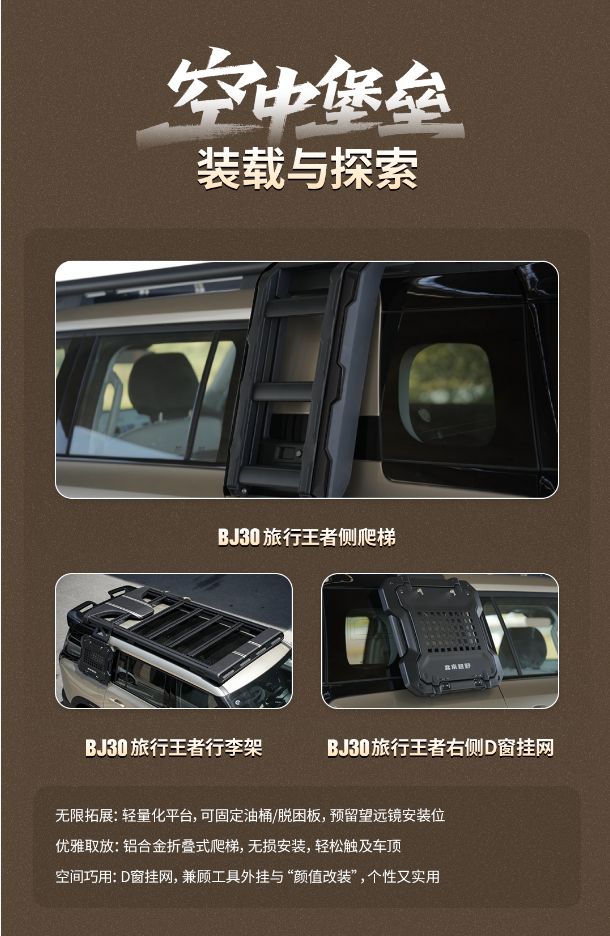 BJ30旅行王者侧爬梯采用轻量化设计平台,可稳固固定油桶、脱困板等装备,同时预留望远镜安装接口,为户外出行提供多元拓展可能;铝合金折叠式行李架爬梯采用无损安装工艺,便于用户轻松利用车顶空间,实现装备的轻松取放;右侧D窗挂网则巧妙兼顾工具外挂需求与视觉美感,做到个性表达与实用功能的双重满足。