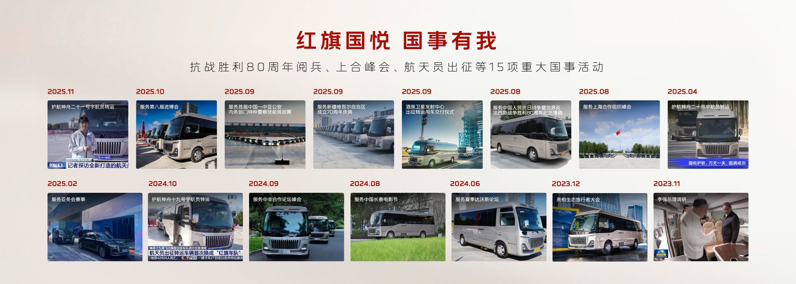 “国家大事有红旗”,红旗金葵花国悦始终践行“国事有我”的使命担当。早在2024年,红旗金葵花国悦便服务于酒泉卫星发射中心,承担神舟十九号载人飞行任务航天员转运保障任务。此后,红旗持续助力航天事业,以专业化、定制化改造,成为航天员专用转运车,为航天员出征提供陆地护航,更相继服务于中非合作论坛、上合峰会、纪念中国人民抗日战争暨世界反法西斯战争胜利80周年阅兵式等一系列高规格国事活动的交通服务保障任务。凭借可靠的性能与出色的表现,红旗金葵花国悦屡获各方的高度评价,尽显“国车”品质与风范。