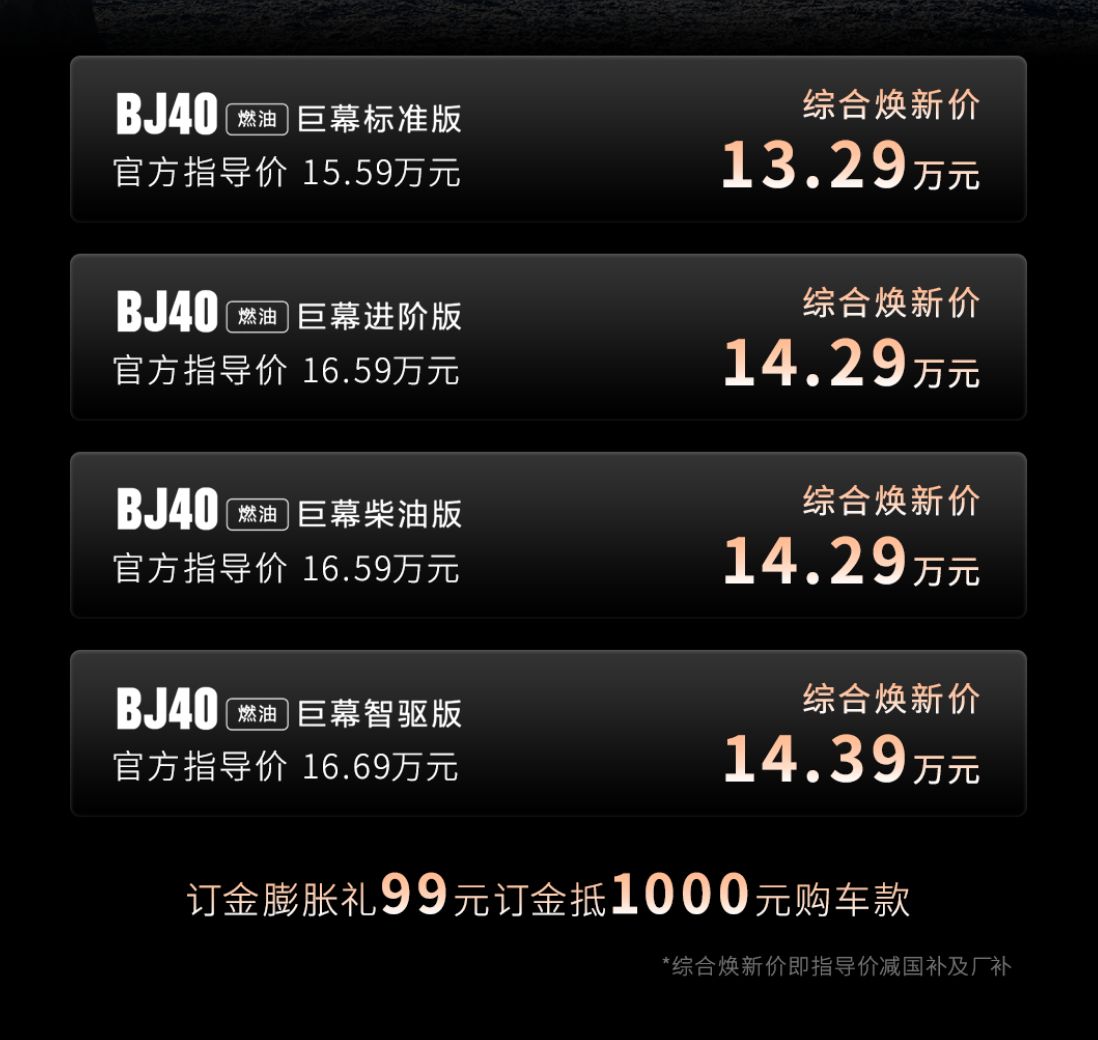 北京越野BJ40燃油巨幕版官方指导价15.59—16.69万元,综合焕新价低至13.29万元。北京越野送上订金膨胀礼:1月27日下订,即可享受“99元订金抵1000元购车款”优惠政策。