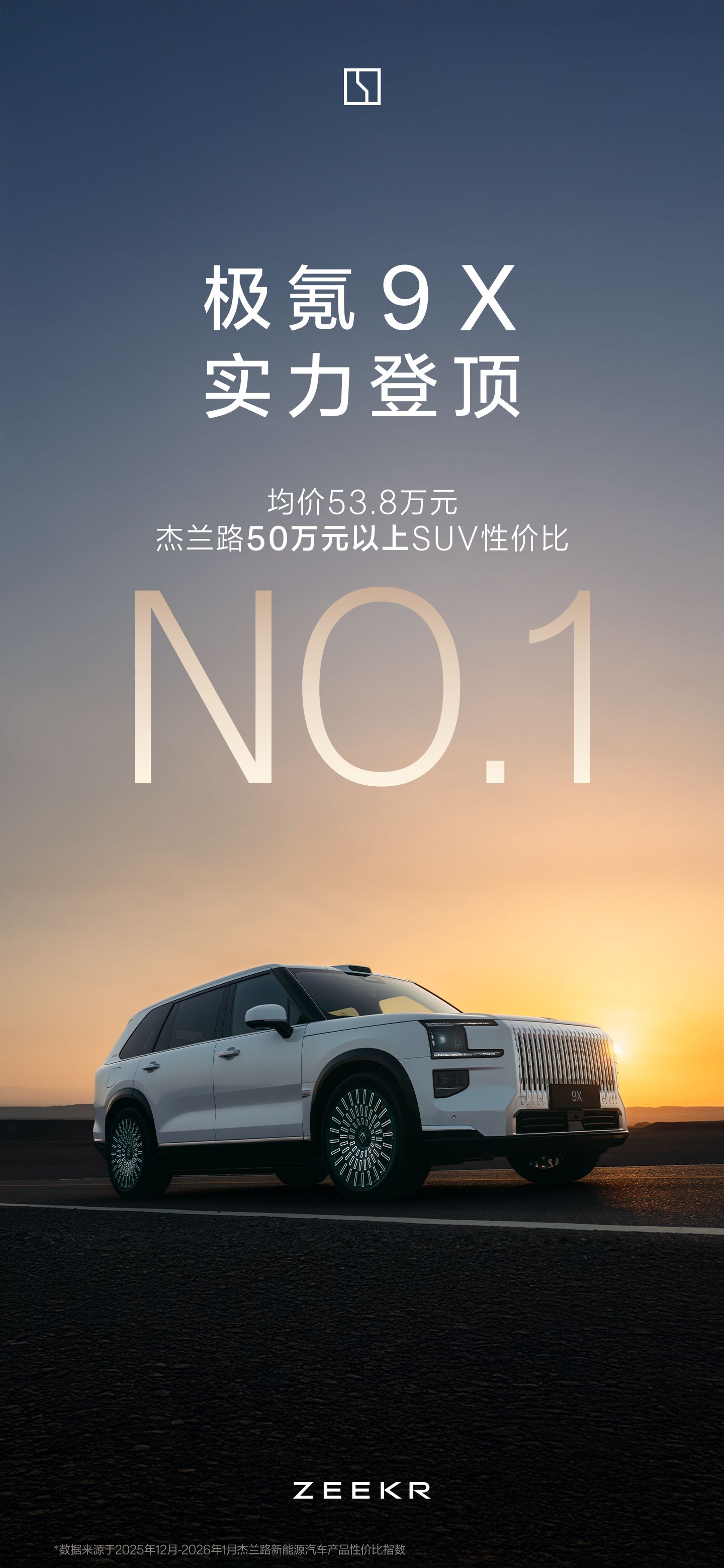旗舰SUV极氪9X去年9月底上市以来,市场热度持续走高,在2025年11-12月连续2个月获得50万级大型SUV销量冠军,连续3个月稳居杰兰路50万元以上SUV性价比榜首,汽车之家&懂车帝50-100万大型SUV口碑分和懂车分第一,持续引领50万级豪华新能源SUV市场。