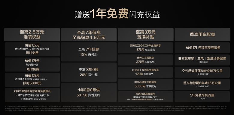 此次上市的腾势Z9GT涵盖纯电、插混两大版本,其中纯电版推出闪充尊荣型、闪充旗舰型、易三方闪充性能型,插混版则有易三方闪充尊荣型、易三方闪充旗舰型可选,丰富的配置梯度满足了不同消费者的用车需求。为配合新车上市,品牌还推出了多重尊享权益,包括1年免费闪充、至高2.5万元选装福利、至高7年低息及4.9万元贴息的金融政策,还有至高3万元的置换补贴,不同品牌置换车主还能享受专属车款减免与服务权益,进一步降低了购车门槛。