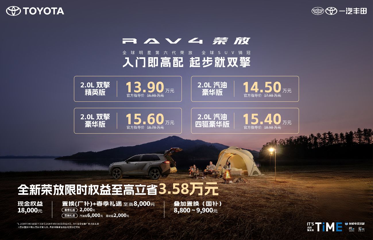 惊喜不止于价格,还有重重福利。2026年3月31日前下订荣放全系并在4月30日前开具发票的用户,即可享受一汽丰田提供的包括春季礼遇和置换补贴在内的至高8000元春日礼。这还不够,用户还可同步享受至高约万元的国家补贴。