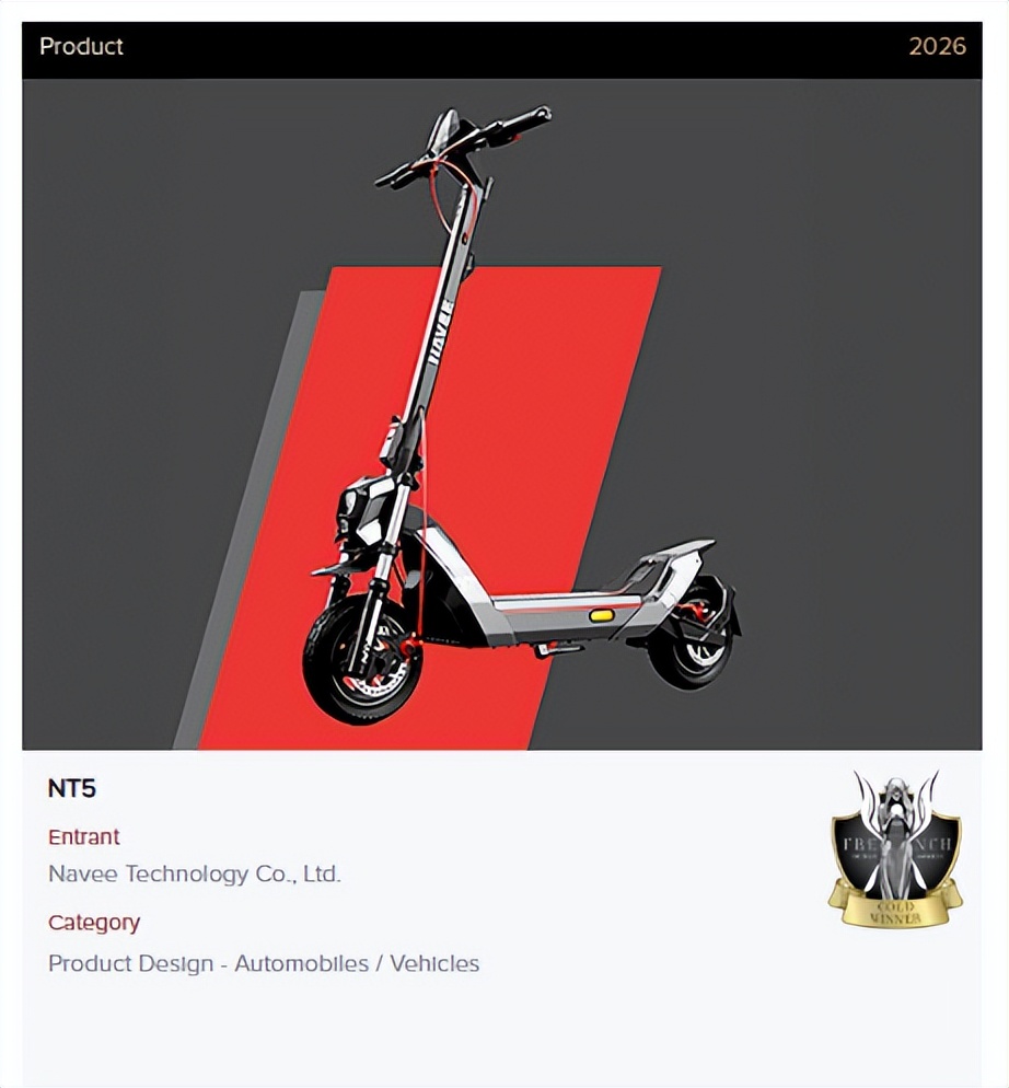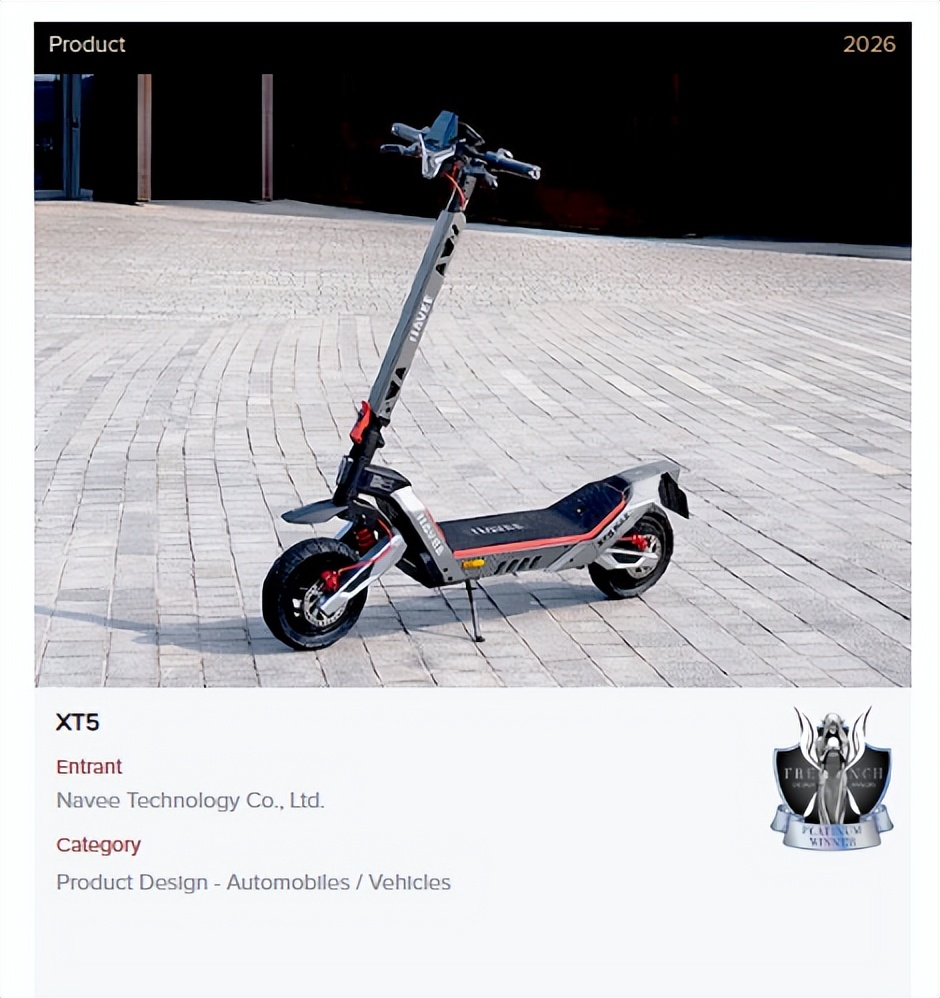 2026年3月,全球工业设计领域殿堂级赛事、国际设计趋势权威风向标法国设计奖(French Design Awards, FDA)正式公布年度获奖名单,全球智能户外生态出行品牌坦途科技NAVEE再创行业纪录,旗下ST5、XT5、NT5、UT5四款电动滑板车全线获奖,其中ST5、XT5斩获赛事最高荣誉铂金奖,NT5、UT5荣获金奖,成为本届赛事短交通领域唯一实现“双铂双金”大满贯的品牌。