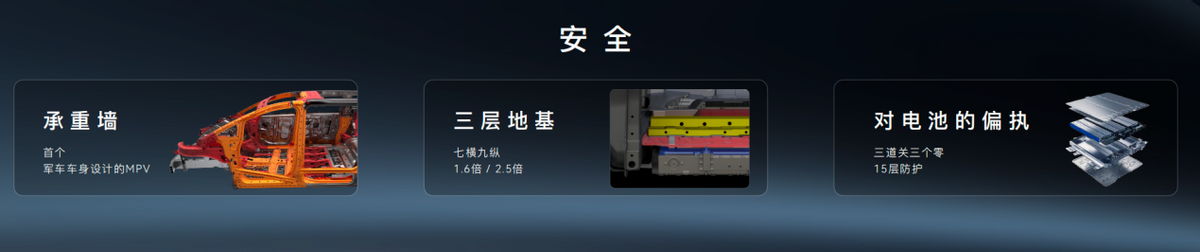 安全性上,泰岳平台做了很多“傻实在”的事情。泰岳平台首次把军车车身设计标准搬到了一台MPV上,打造车上的“承重墙”;地板七横六纵结构,足足做了“三层地基”。另外,电池开发过程对安全品质的追求近乎偏执:电芯生产原材料追求“零杂质”、制造过程力求“零缺陷”、电芯成组强调“零短板”。不仅如此,电池包还做了15层的立体硬防护结构;面对特殊情况,电芯侧面都包了一层能耐1000℃高温的航空级隔热材料,顶部还有一层耐1200℃陶瓷化阻燃结构,给每个电芯筑成了一个“安全屋”。