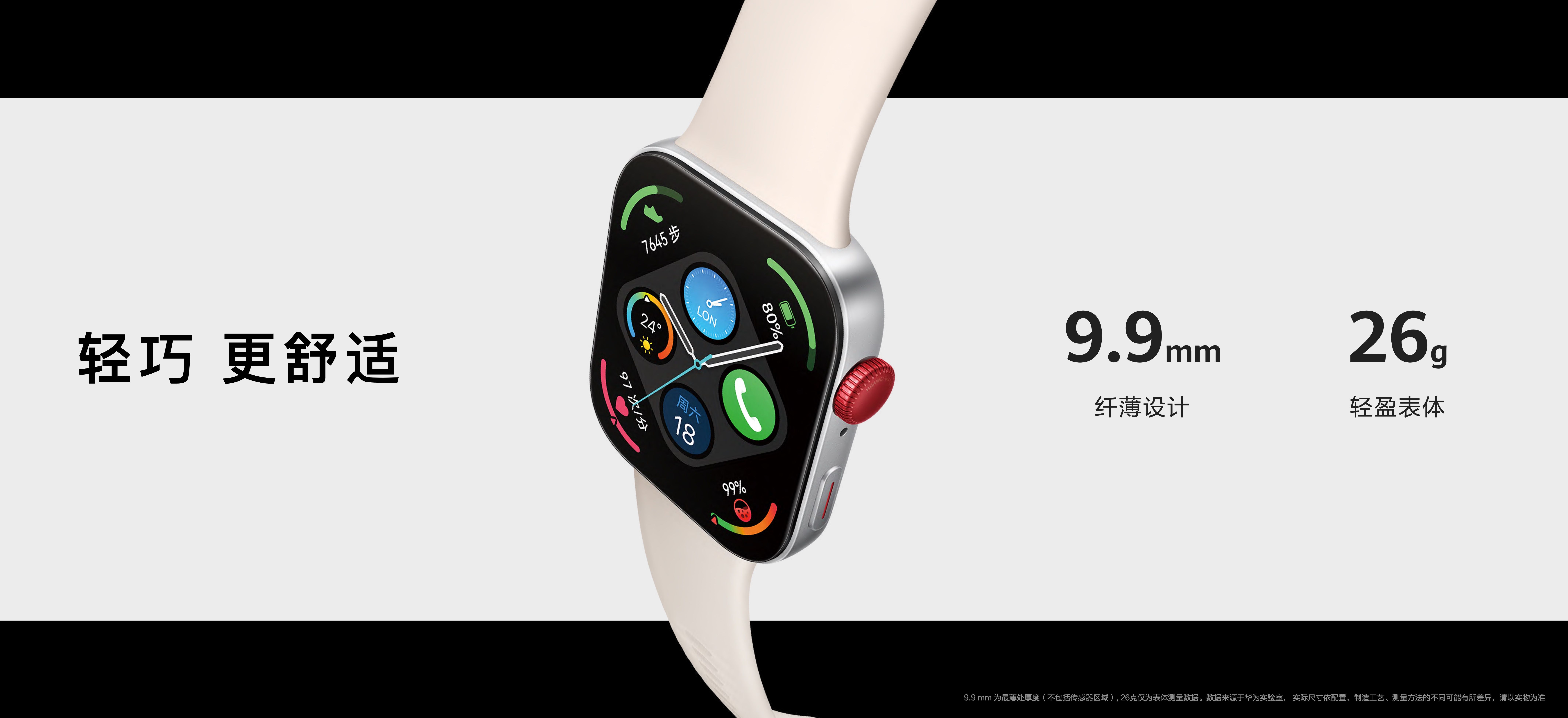 华为WATCH FIT 3采用了阶梯型的屏幕设计,搭载1.82”AMOLED高清超大屏,将屏占比提升至77.4%,带来更立体、更宽广的视觉体验,搭配铝合金金属机身,尽显高端质感。同时,机身厚度9.9mm[1],表体重量仅26g,相当于一颗草莓的重量,成为迄今华为最轻薄的智能方表。同时,屏幕最高亮度可达1500nits,且支持明暗自动调节,强烈日光下也能清晰易读,暗光环境不晃眼;此外,手表整机长度缩短到43mm,大小手腕均可轻松佩戴,带来轻薄、舒适的佩戴体验。
