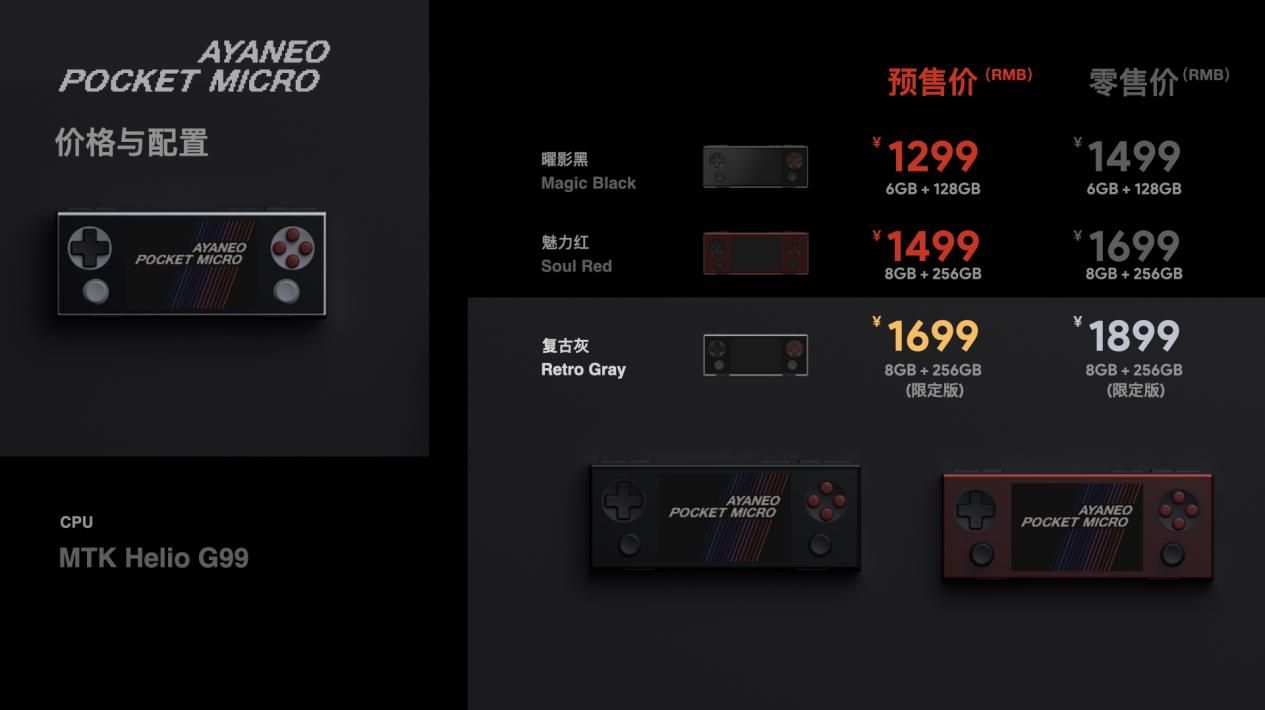 AYANEO Pocket MICRO 标准版预售价 1299 元起,复古色限定版 1699 元,首批将于 9 月初开始发货。