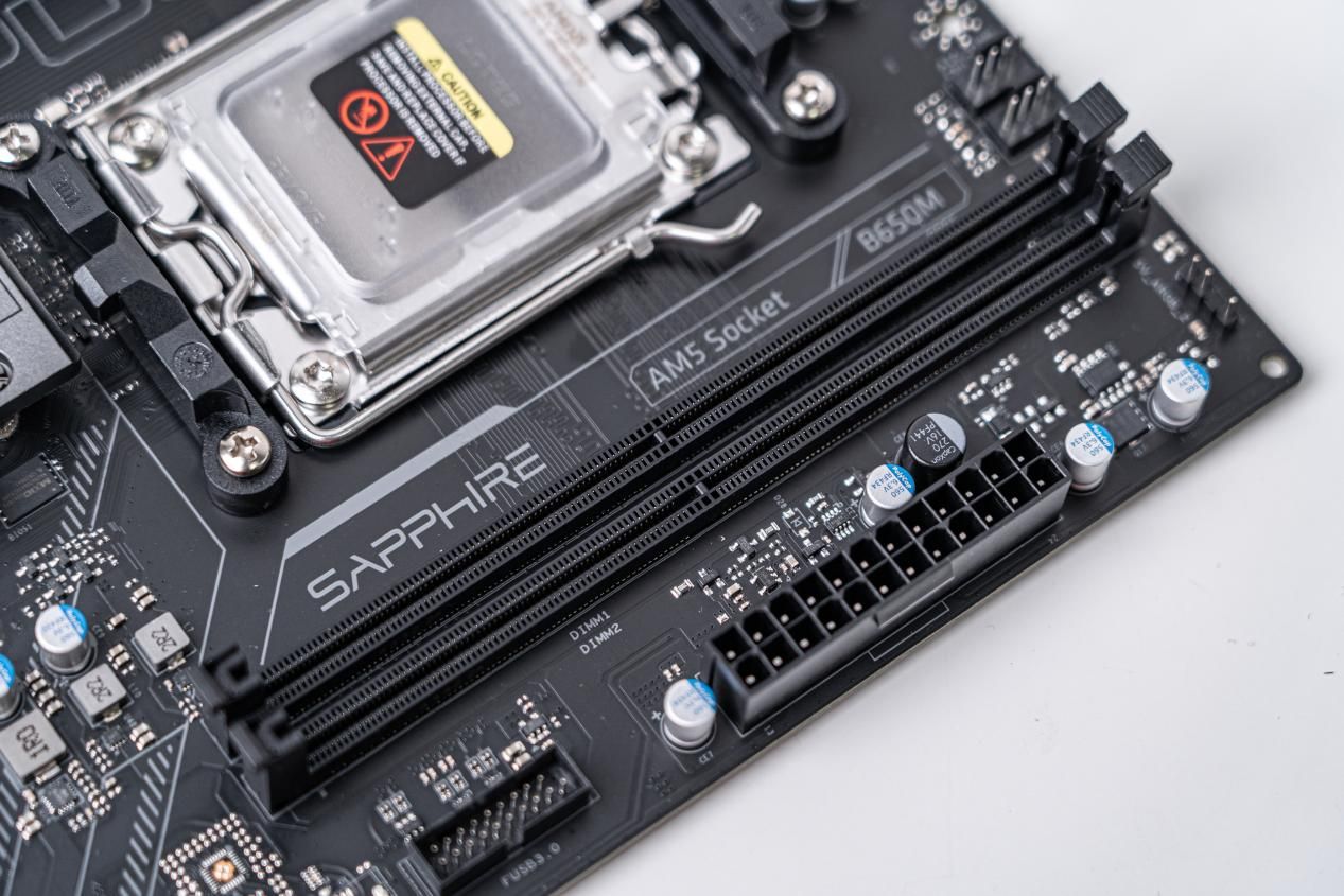 AM5插槽设计,LGA1718接口,让它可以兼容锐龙7000/8000G/9000/9000X3D等众多的处理器,而且它还可以兼容AM4散热器。CPU供电接口采用了单8pin设计,对于能耗比优秀的锐龙处理器来讲,完全够用了。
