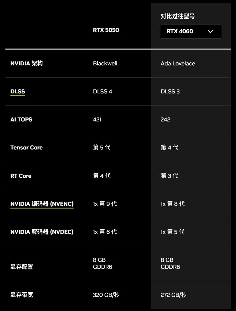 NVIDIA RTX 5050采用NVIDIA最新的Blackwell架构,基于4nm工艺制程,集成约 188亿晶体管。配备2056个 CUDA 核心,光追单元与Tensor核心数量较前代有所提升,搭载8GB GDDR6显存(128-bit 位宽),显存带宽 320GB/s,显存频率20GHz。基础频率2317MHz,核心Boost频率2572MHz,TBP功耗130W,采用单8 Pin供电设计。