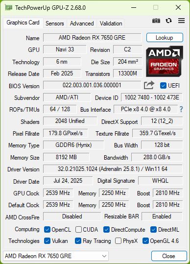 AMD Radeon RX 7650 GRE采用先进的RDNA 3架构打造,采用6nm工艺制程,核心代号Navi 33,芯片面积 204mm²,集成133亿晶体管。硬件规格上,其配备32个计算单元,包含2048个流处理器、64个ROP单元及128个TMU 单元,搭配8GB GDDR6显存(128-bit位宽),显存带宽达288GB/s。核心基础频率最高能到2539MHz,Boost频率可至2810MHz,建议功耗170W,供电接口为双8 Pin设计。