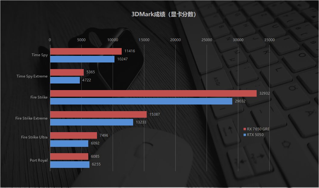 可以看到,在新驱动的加持之下,AMD RX 7650GRE的理论成绩较之首发评测时,又有了一点点的进步。和RTX 5050对比的话,AMD RX 7650GRE的领先还是非常明显的,其中FS、FSE 和FSU分别领先RTX 5050约为13.43%、16.28% 和 23.05%,性能表现出色。TS和TSE这边,同样具备11.41%和13.62%的领先优势。针对光线追踪的Port Royal测试成绩也表明,光追性能这个N卡家的传统强项已经被基本追平。没想到在RX 7650GRE面前,RTX 5050与RTX 4060也没什么区别,基本也是被全面吊打。