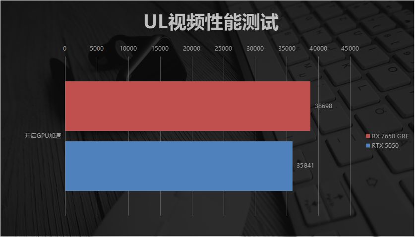 内容创作方面,我们选择UL进行测试,开启GPU加速后,两者差距在7.9%左右。也就是说RX 7650 GRE在生产力和内容创作这一块,也是更加给力的。
