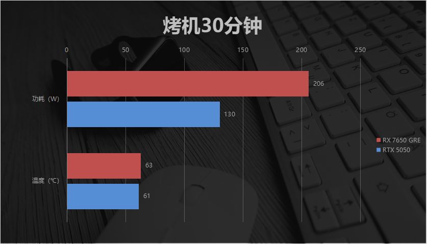 烤机实测,RTX 5050满载功耗和温度,满载为130W,温度为 61℃。AMD RX 7650GRE 的功耗为 206W, 温度为 63℃。在这一点上,RTX 5050终于赢了一回,温度稍低这么一点不算啥,但是功耗只有RX 7650 GRE的一多半,如果比省电的话优势还是有一些的。