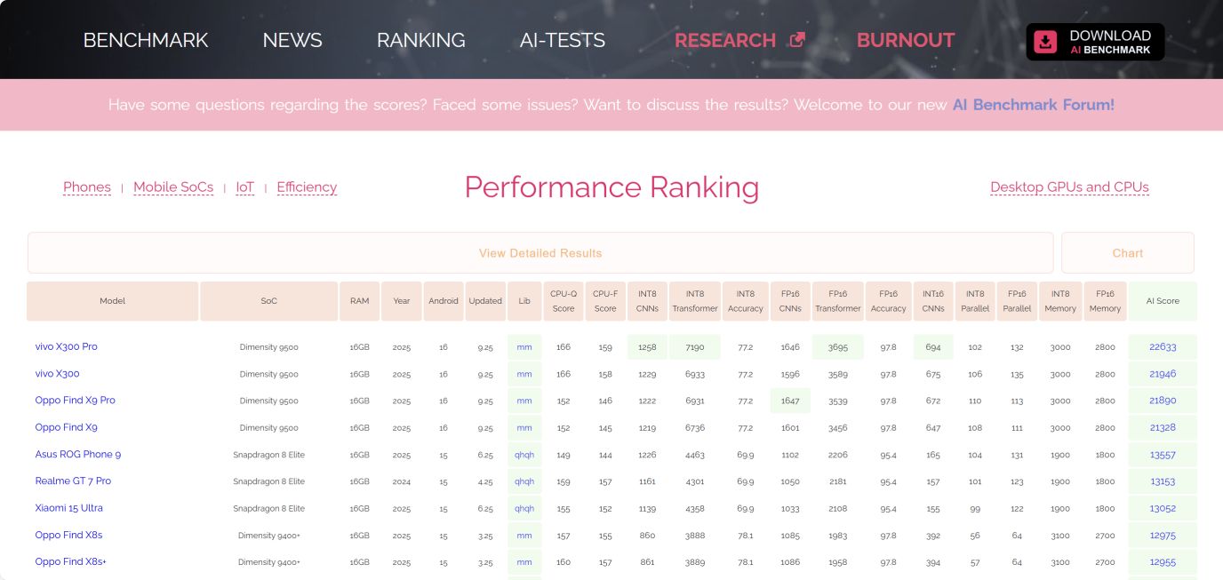 从榜单数据来看,天玑9500的表现堪称"断层领先"。vivo X300 Pro凭借天玑9500芯片,以22633分的AI总分稳居榜首,同系列的vivo X300紧随其后,AI总分达21946分;OPPO阵营的Find X9 Pro和Find X9也不遑多让,分别以21890分、21328分跻身前四。对比搭载竞品芯片的机型,天玑9500机型的领先优势十分明显——排名第五的Asus ROG Phone 9(搭载骁龙8 Elite)AI总分仅13557分,不足vivo X300 Pro的六成。