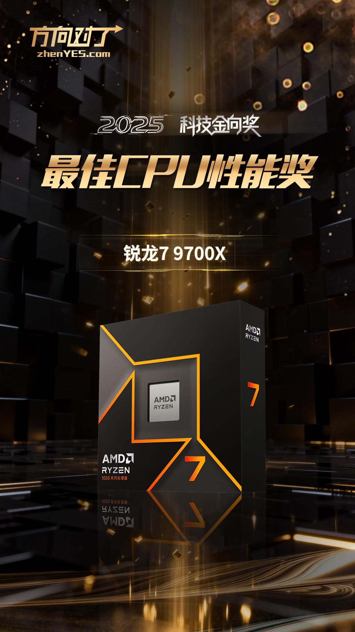 近日,科技互联网业内知名的科技金向奖正式揭晓2025年度科技产品的评选结果,本届评选历时三个月,吸引全球超150件尖端科技产品及技术参与角逐,经过技术实测、行业专家评审、用户口碑调研三重严苛筛选,最终仅十余件具备技术突破性与市场引领性的产品及技术脱颖而出。其中,锐龙7 9700X成功斩获2025科技金向奖“最佳CPU性能奖”殊荣。