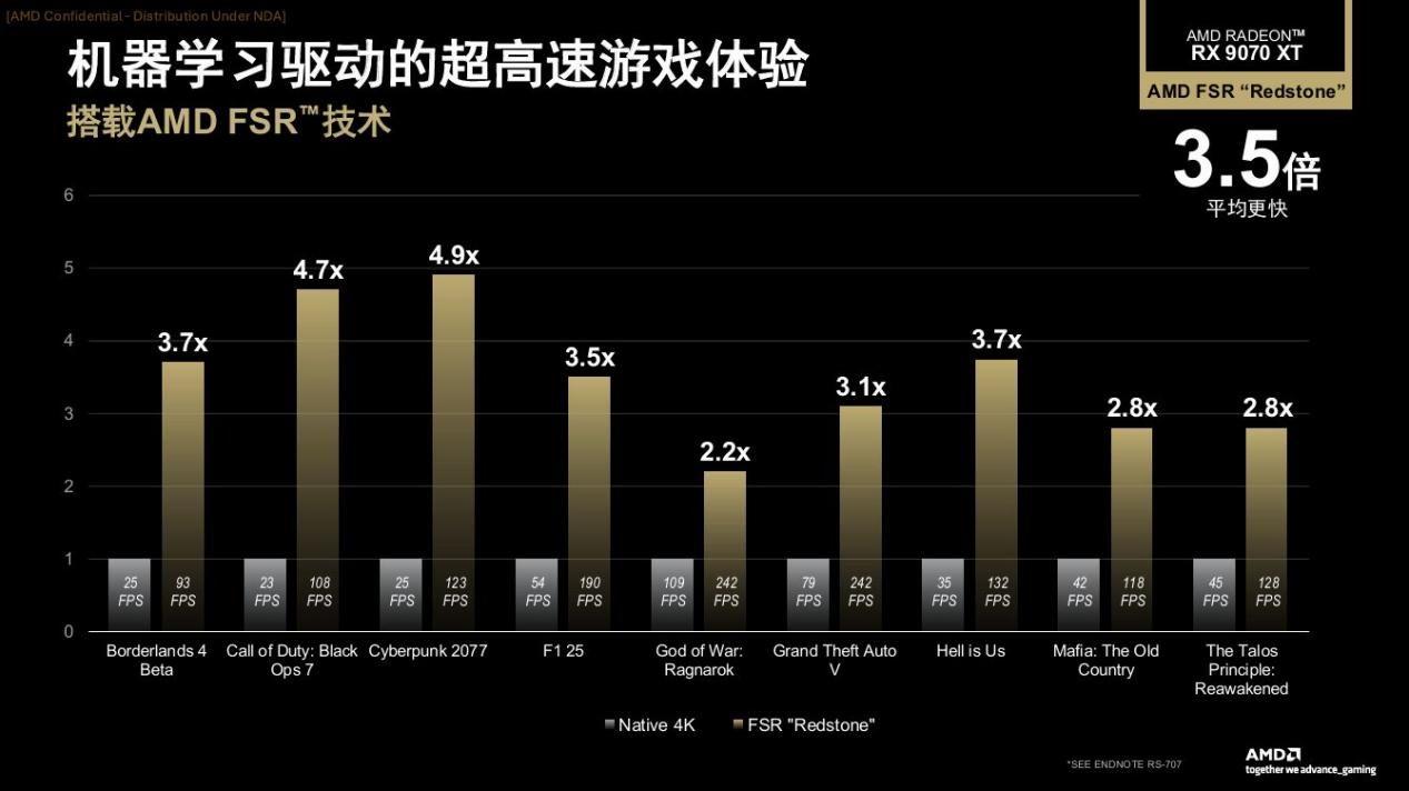 具体到性能提升方面,AMD在活动中公布的实测数据颇具说服力。在RX 9070 XT显卡上,开启FSR Redstone技术后,4K场景下的性能较原生渲染提升2.2倍至4.9倍不等,平均下来是原生的3.5倍。