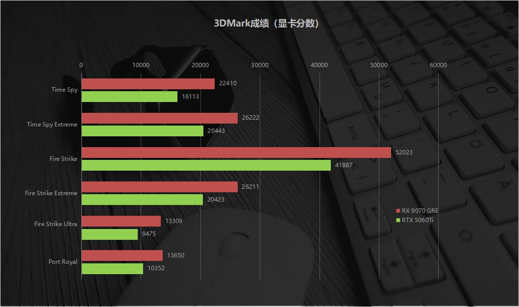 在3DMark基准测试中,RX 9070 GRE展现出压倒性优势。