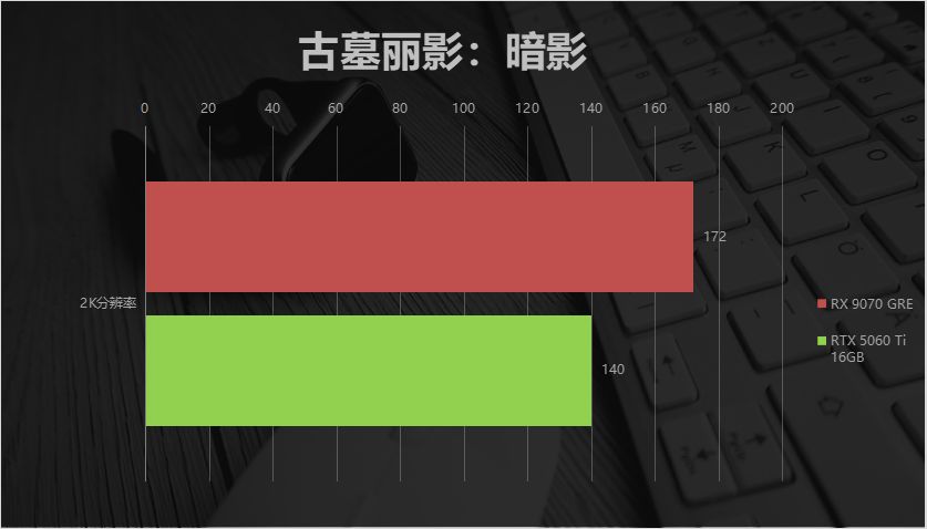 《孤岛惊魂6》、《古墓丽影:暗影》、《永劫无间》、《赛博朋克2077》四款游戏中,RX 9070 GRE对比RTX 5060 Ti 16GB均实现了超过20%的“大比分”碾压。但这还不是最夸张的。