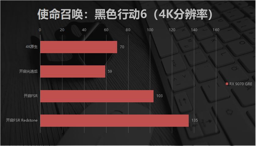 这里我们再专门测试一下FSR Redstone技术的实际效果。将《使命召唤:黑色行动6》调整到4K分辨率下进行,RX 9070 GRE平均帧数为70。在开启光追后,帧数降低到了59。开启FSR后,即使在开启光追的情况下,它的帧率也实现了破百。而在FSR Redstone开启后,帧率直接来到了135,在4K分辨率和光追的双重影响下,依然可以实现接近原生翻倍的帧率效果。