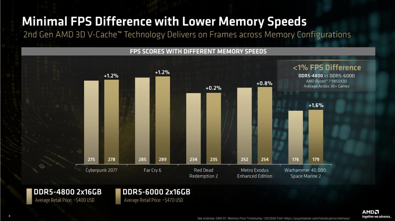 而选对一款适配的处理器,就能从根源上避开这个问题,AMD 锐龙 7 9850X3D就是这类高适配性的代表。这款处理器的核心设计,让它对内存频率的依赖度大幅降低,无需刻意选购那些主打电竞超频、溢价明显的高端内存条,仅需搭配品牌正规、定价亲民的DDR5普条,就能释放出近乎全部的游戏性能。