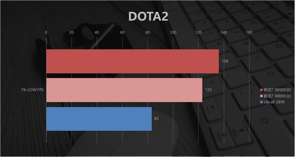 《DOTA2》的相关测试里,9850X3D的368FPS 更是比285K的217FPS 高出约69.59%。