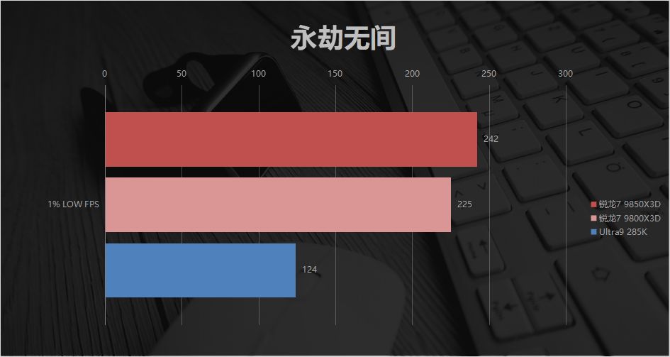 实测数据显示,锐龙 7 9850X3D在《DOTA2》、《永劫无间》、《赛博朋克 2077》、《古墓丽影:暗影》等游戏中,1% 低帧率均以显著优势领先Ultra 9 285K。《DOTA2》中达到了Ultra 9 285K的1.6倍。《永劫无间》中更是大幅拉开与Ultra 9 285K的差距,95.16%的帧率差距,基本可以说是倍数了。即便是在《赛博朋克 2077》这类对硬件要求苛刻的3A大作中,也能凭借195FPS的1%低帧率,让Ultra9 285K(110FPS)难以望其项背。