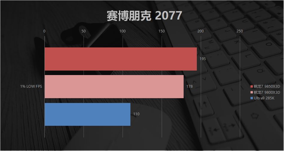 实测结果清晰表明,在3A单机场景中,锐龙 7 9850X3D的表现依然全面领先,不仅以明显优势压制了Ultra9 285K,在同系对比中也展现出了升级后的性能飞跃。在《赛博朋克2077》中,9850X3D以279帧领先9800X3D的268帧,更比Ultra 9 285K的227帧高出了约22.9%。