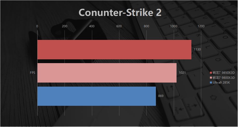 从实测数据来看,在《CS2》低画质场景中,锐龙 7 9850X3D以1130FPS 的成绩领跑,比9800X3D的1021FPS更胜一筹,而Ultra 9 285K仅能达到869FPS。