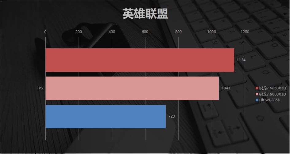 在《英雄联盟》基地空载场景里,9850X3D的1134FPS,同样大幅拉开了与285K 723FPS的差距。