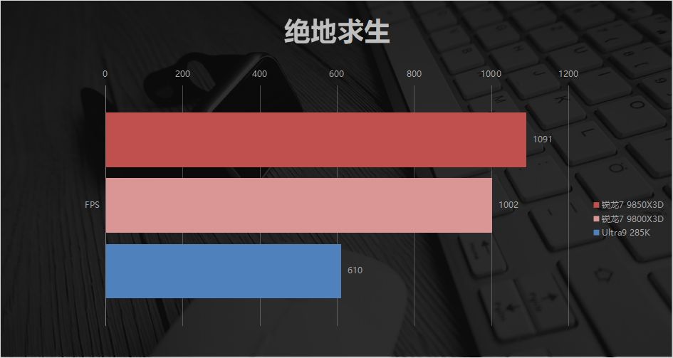即便是高画质的《绝地求生》跳伞环节,9850X3D也以1091FPS的表现,将285K的 610FPS远远甩在身后。