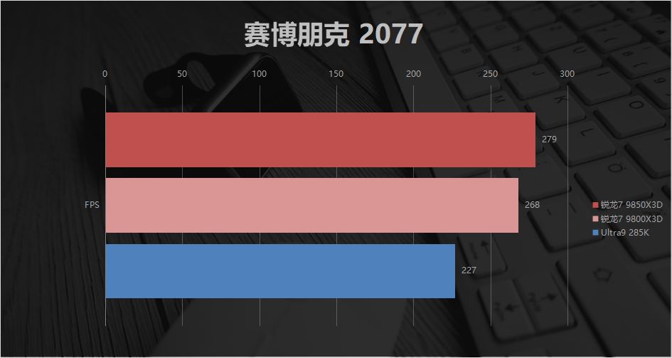 实测结果清晰表明,在3A单机场景中,锐龙 7 9850X3D的表现依然全面领先,不仅以明显优势压制了Ultra9 285K,在同系对比中也展现出了升级后的性能飞跃。在《赛博朋克2077》中,9850X3D以279帧领先9800X3D的268帧,更比Ultra 9 285K的227帧高出了约22.9%。