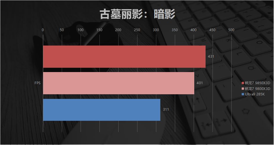 到了《古墓丽影:暗影》,9850X3D的431帧比Ultra9 285K的311帧足足领先了 38.6%。