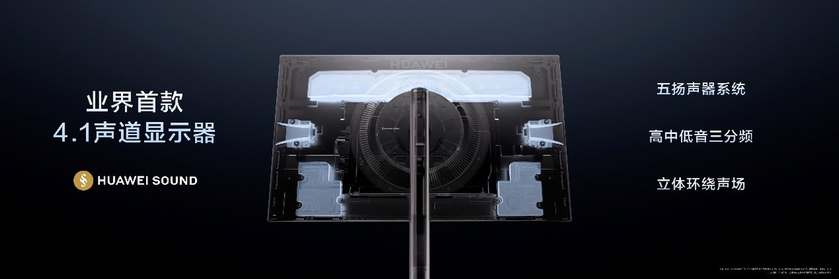 “重视觉、轻听觉”曾是显示器行业的固有观念,而全新一代华为MateView GT打破了这一传统研发思路,在打造卓越视觉体验的同时,更带来了更沉浸的音质表现。HUAWEI MateView GT27英寸的Sound款获得华为悦彰品牌认证,创新采用4.1声道架构,在传统2.0声道基础上,新增独立低音单元及左右环绕高音单元,有效拓宽声场范围,极大丰富了声音的层次与细节。高、中、低音三分频设计的外放声学系统,共有5个扬声器,包含左右全频扬声器2个、左右高频扬声器2个以及1个独立低频扬声器。声场中心抬升至与人耳平齐的高度,让用户在看电影、听音乐或玩游戏时,无需额外音箱即可享受环绕沉浸的听感,带来更立体、更真实、更饱满的听觉盛宴。