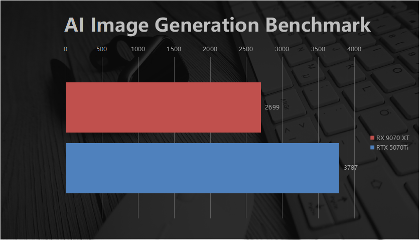 AI本地推理测试中,在StableDiffusion1.5(FP16)图像生成测试里,RTX 5070Ti取得了3787分的成绩,瀚铠RX 9070 XT得分为2699分,竞品在AI生图场景中拥有更明显的优势。