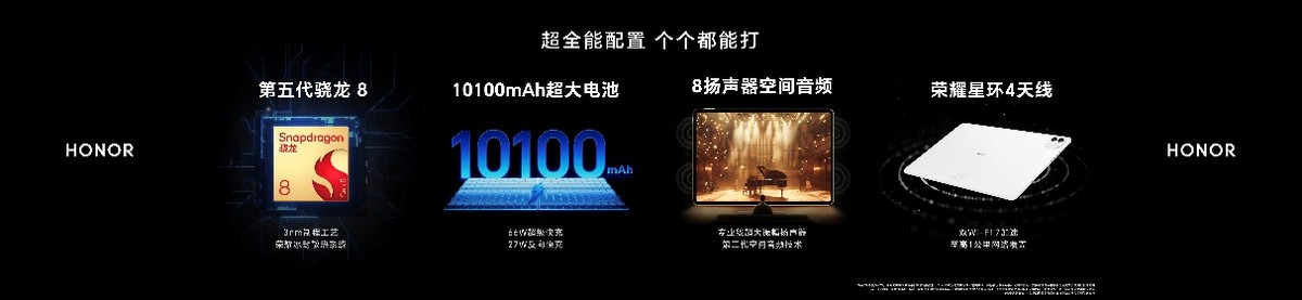 荣耀MagicPad3 Pro 12.3搭载第五代高通骁龙8旗舰芯片,配合荣耀冰封散热架构,实现满血性能稳定释放,高效平衡性能功耗,为多任务处理、视频后期、AI运算、3A游戏运行提供强劲性能;内置10100mAh超大电池,支持66W超级快充、27W反向充电,不仅告别续航焦虑,还能为iPhone等其他系统设备充电;荣耀自研星环四天线,支持双Wi-Fi 7加速,实现一公里超远距网络覆盖;八扬声器与第三代空间音频技术加持,进一步拓展了娱乐、学习等使用场景,结合全维度软硬件生态融合,覆盖用户使用痛点,打造全场景极致体验。