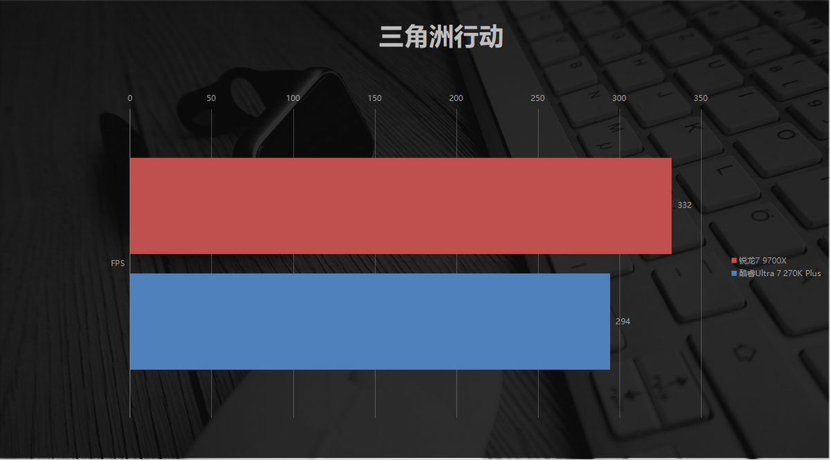 《三角洲行动》这里,锐龙7 9700X再次大幅度超越了酷睿Ultra 7 270K Plus,领先幅度来到了12.93%。