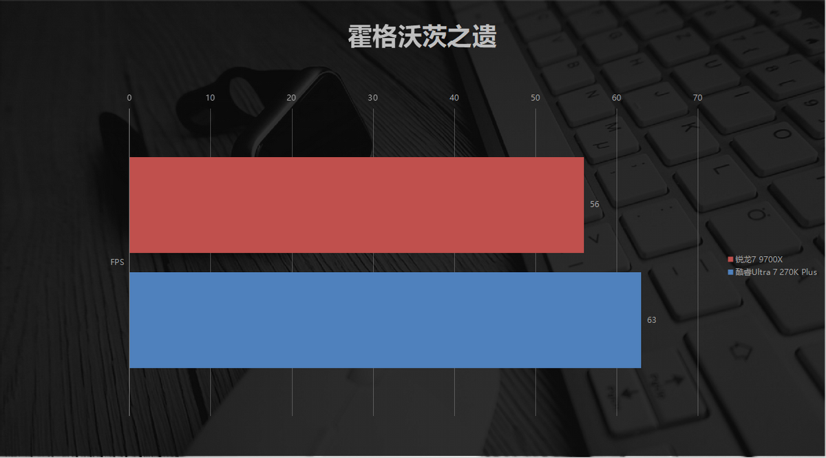 而在《霍格沃茨之遗》这边,酷睿Ultra 7 270K Plus又凭借63fps的成绩,反超了锐龙7 9700X的56fps。