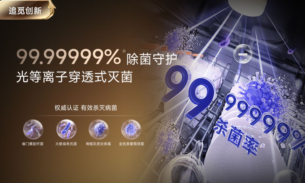 追觅还通过4重防护构筑了消杀防线,其中追觅创新了光等离子消杀净味,通过高活性离子随空气扩散,360°穿透缝隙死角,覆盖UV灯照不到的地方,搭配UV灯形成双重保障,杀菌率达到99.99999%,7个9的杀菌率高,让有娃家庭更加省心。