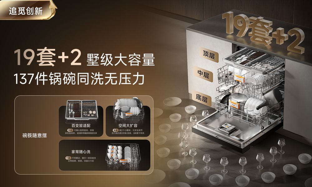 采用19套+2大容量内腔布局,可一次性容纳137件餐具,包括炒锅、汤碗、餐盘、筷子、勺子等全套厨具,甚至能轻松放下炒锅与大型汤煲,避免传统小容量洗碗机“分次清洗”的麻烦,适配多人口家庭日常使用及亲友聚餐后的清洁场景。