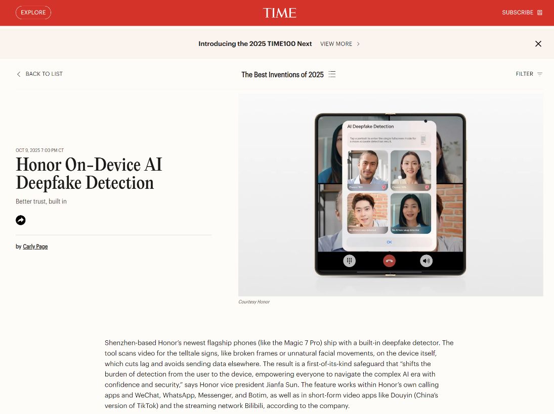 突破电池极限、深耕AI反诈 荣耀两项技术登《时代周刊》2025最佳发明主榜