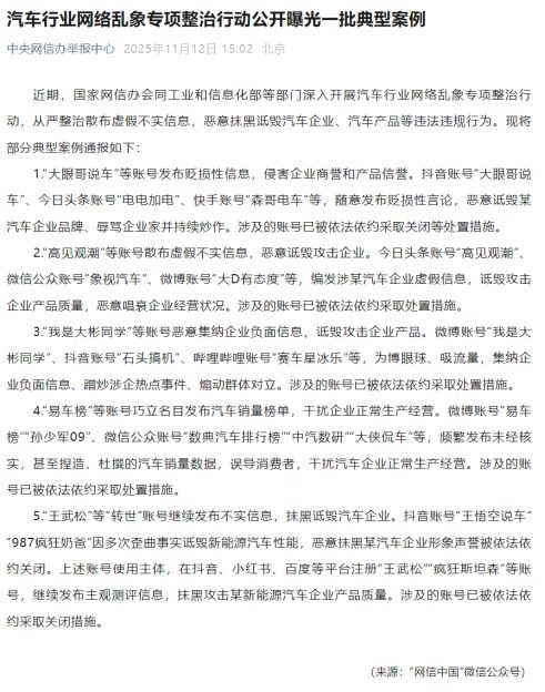 此前,中央网信办在《汽车行业网络乱象专项整治行动公开曝光一批典型案例》中就明确指出,抖音账号“王悟空说车”“987疯狂奶爸”因多次歪曲事实诋毁新能源汽车性能、恶意抹黑汽车企业形象声誉,被依法依约关闭。