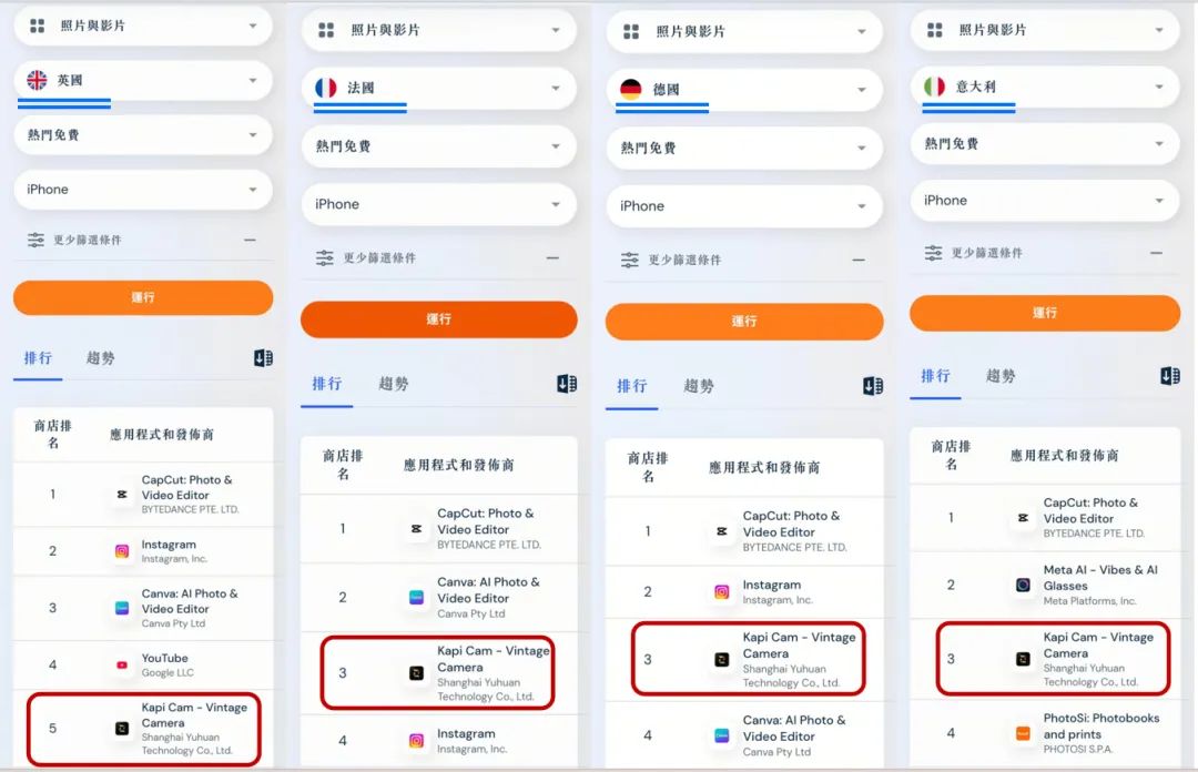 随后在欧洲,Kapi相机的热度迅速蔓延,在英国、意大利、法国、德国等国的App Store“照片与视频”应用排行榜中,近期均成功跻身前五名。