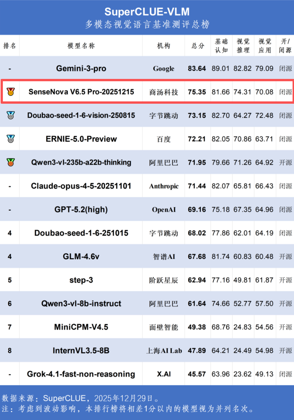 12月29日,权威大模型评测基准 SuperCLUE 发布《中文多模态视觉语言模型测评基准12月报告》,商汤日日新V6.5(SenseNova V6.5 Pro)以75.35的总分位列国内第一,斩获金牌,并在视觉推理维度上拿下国内最高分。