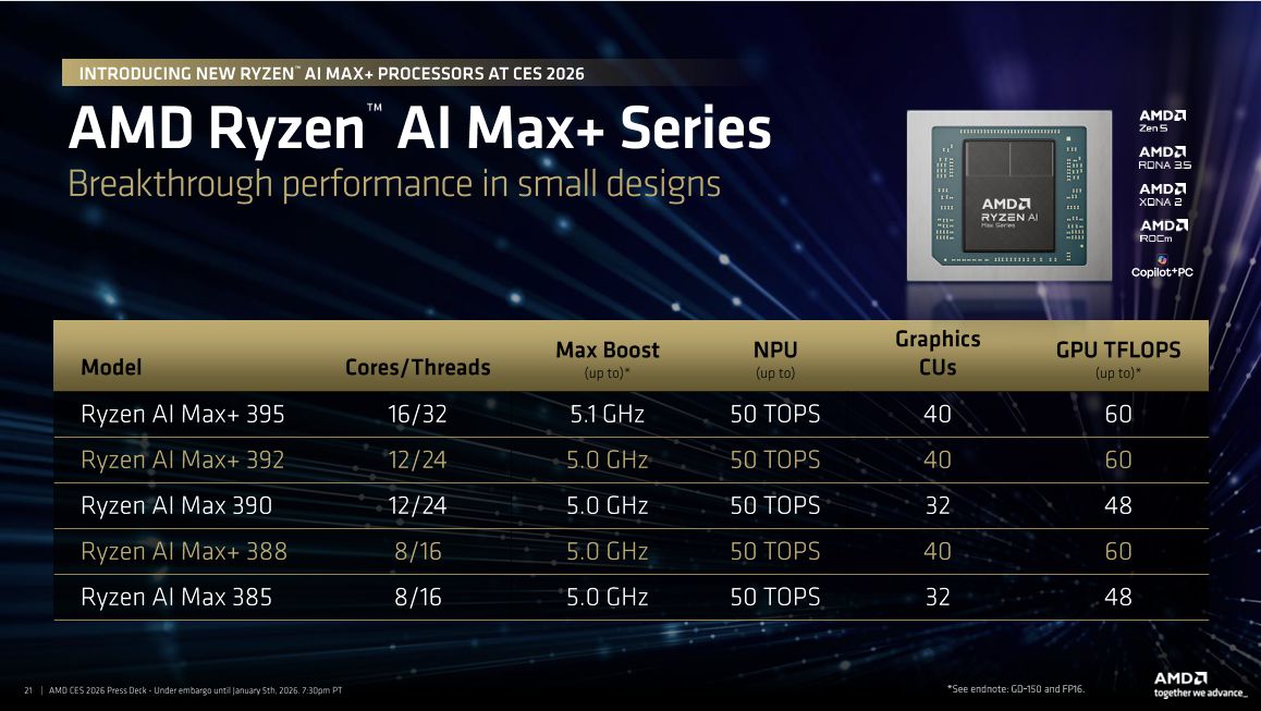 针对高端专业用户,AMD进一步扩充锐龙AI Max+系列,新增锐龙AI Max+ 392与388两款型号,与此前发布的395形成“16核、12核、8核”的完整旗舰矩阵。